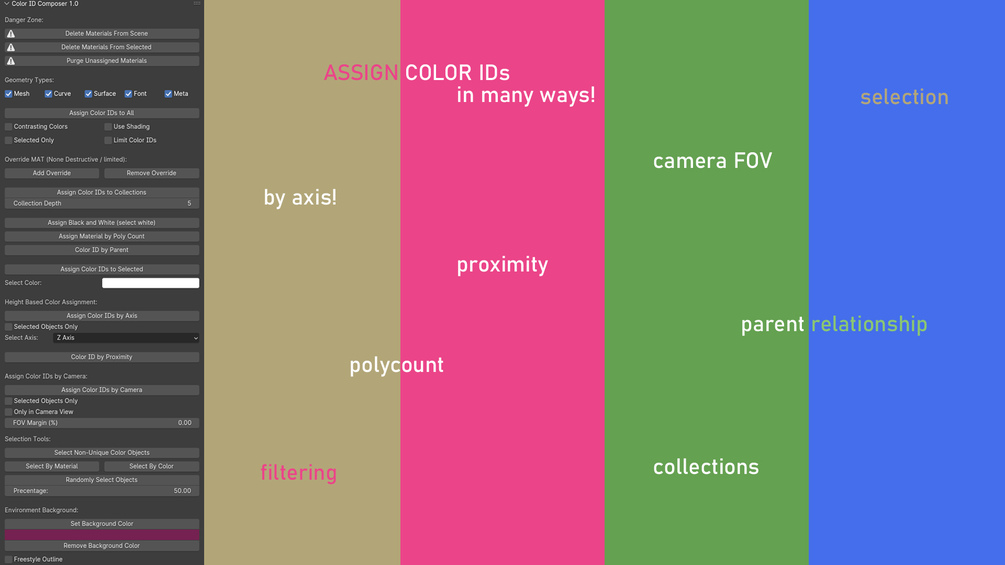 The Color ID Composer is a blender addon tool intended to unify a bunch of tools and workflows into a single place that provide the user with multiple ways to assign IDs to the scene with varying options to control how the IDs are assigned such as using axis direction, distance from the camera, FOV, varying selection methods and more! I really wanted to ensure i packed as many features into the addon as possible that would hopefully ensure the process of assigning IDs is as quick and easy as possible.